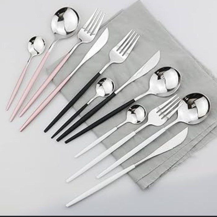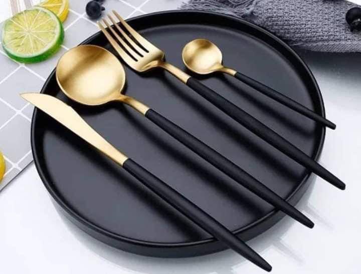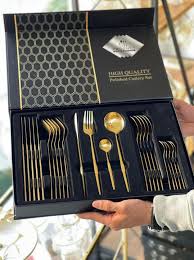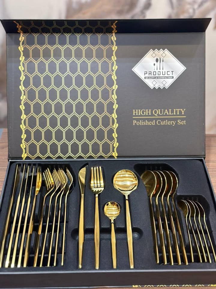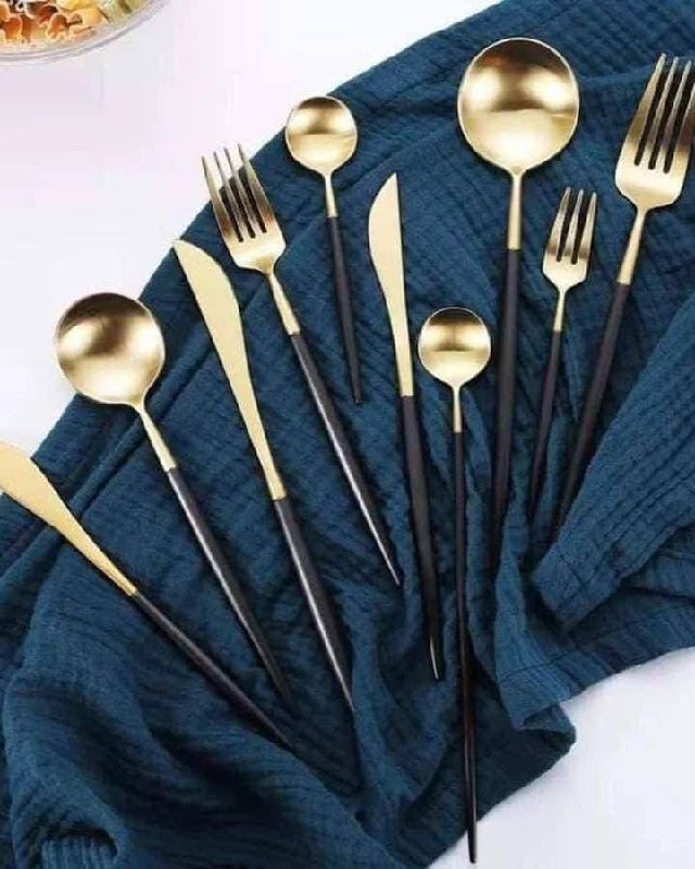 إضافة فخامة حقيقية لسفرتك: طقم ذهبي أنيق لـ 6 أشخاص (شوك، سكاكين، ملاعق طعام، ملاعق شاي). ستانلس ستيل متين، طلاء ثابت، تلميع مرآة يخطف الإضاءة، وآمن في غسالة الصحون.