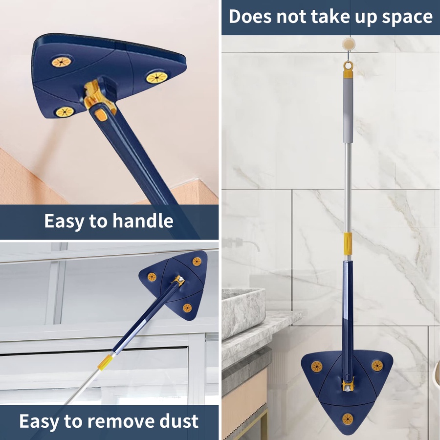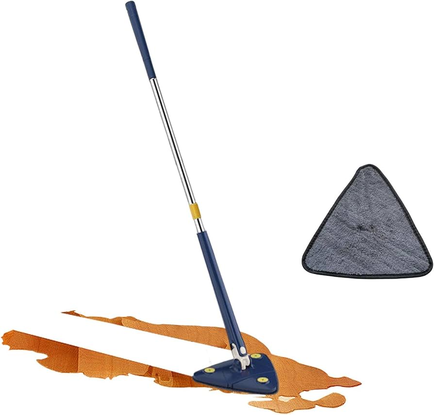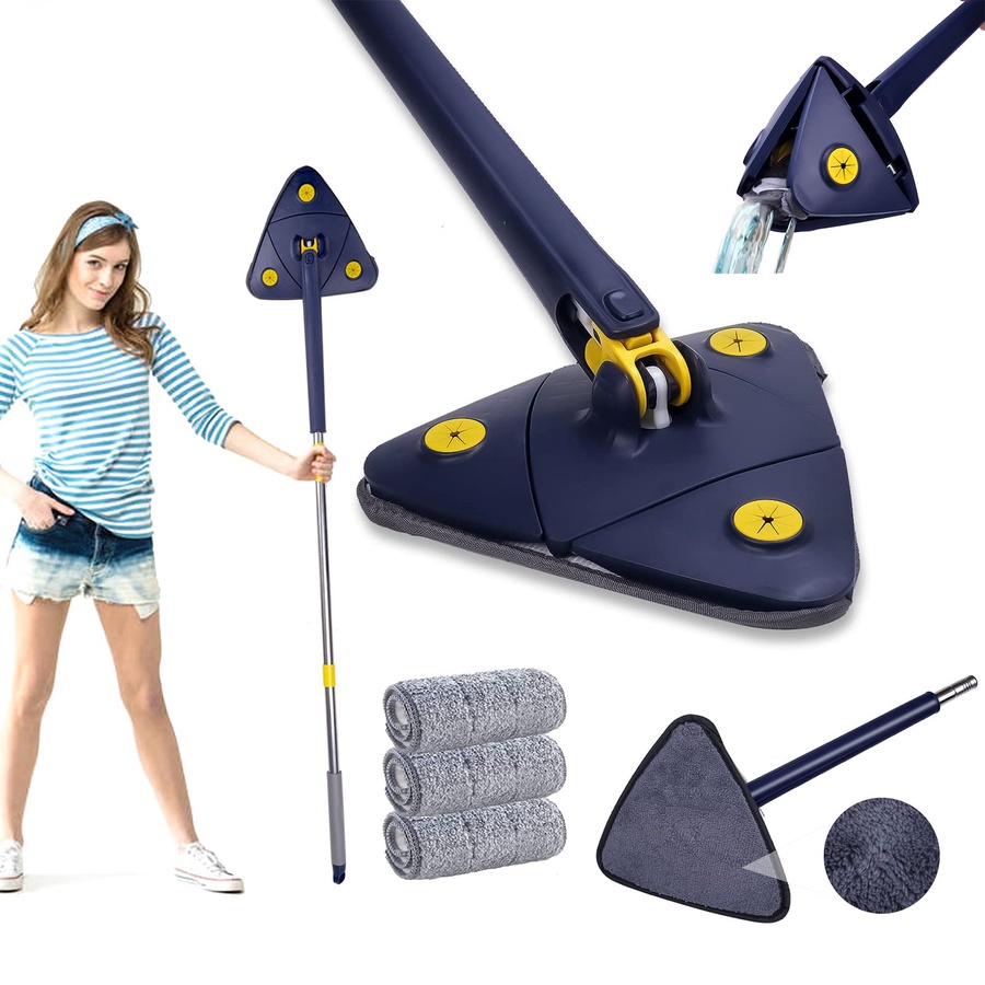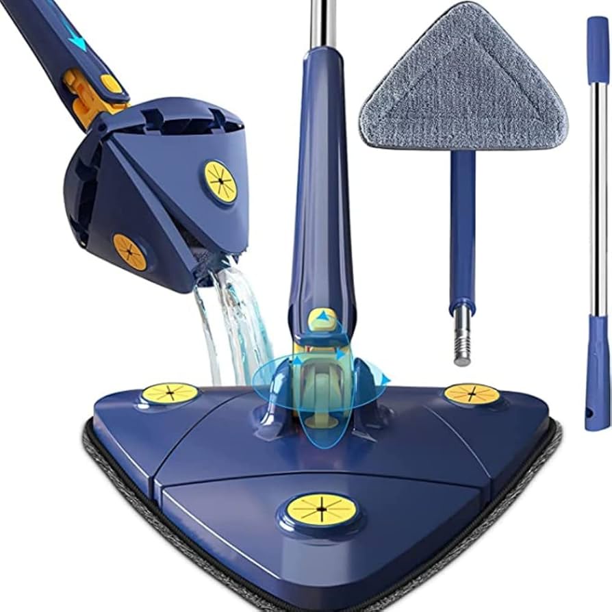 High-quality triangular spin mop with stainless handle, 360° rotation, and microfiber head. Self-wringing system with extra replacement pad included.